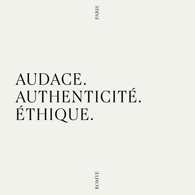 Romye Paris est une marque française consciente, fondée sur les principes de singularité, de durabilité et d'audace.